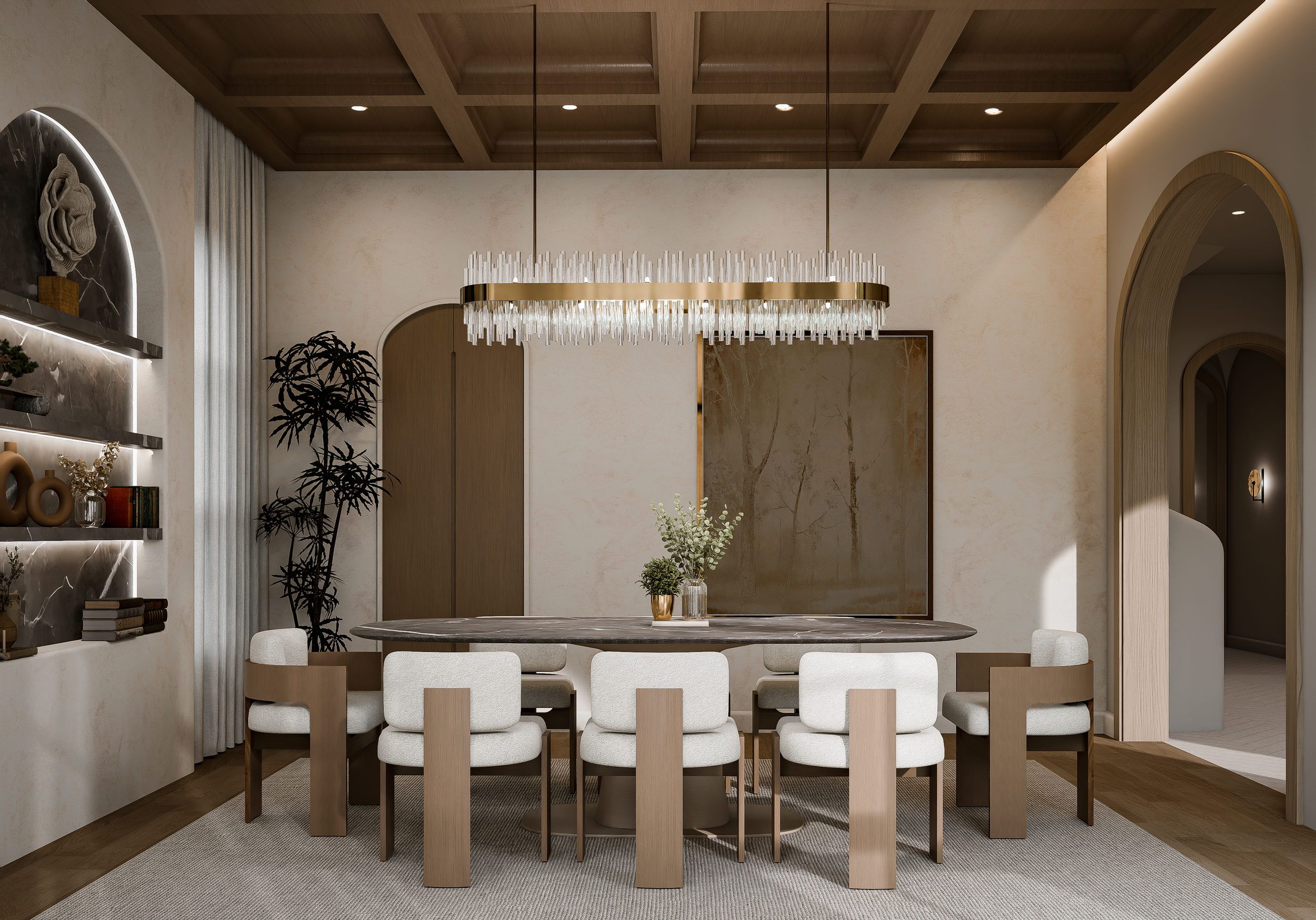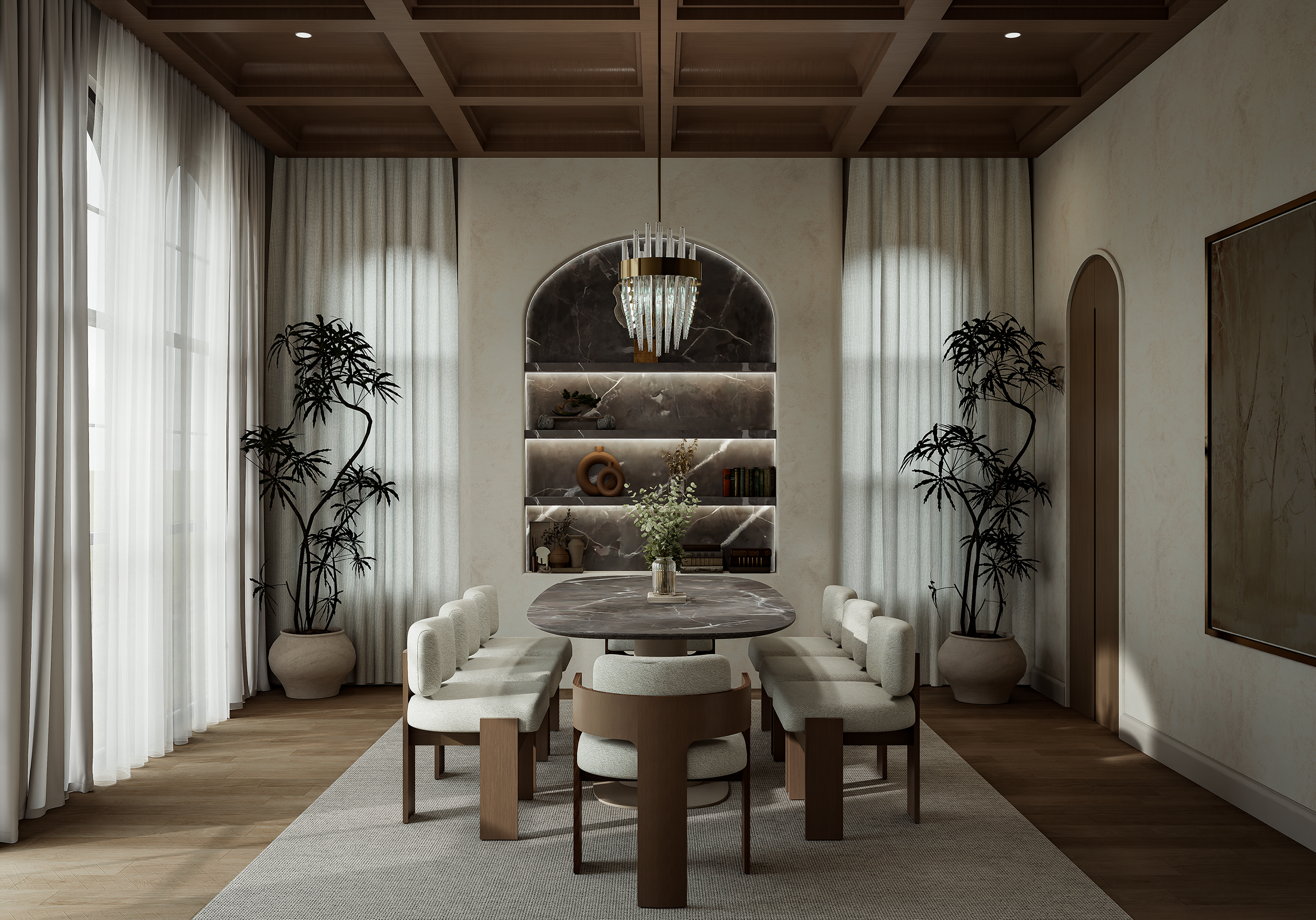 From the grand entry hall that sets an immediate tone of old-world hospitality, to the family room and dining area designed for generous, gracious living, every room in The Villa Terra Rossa tells a cohesive story. The kitchen and butler's pantry are built for serious entertaining, while the private study and guest suite offer sanctuary within the home. Earthy tones, natural materials, arched details, and hand-curated finishes run throughout — a design language rooted in the Mediterranean coast and perfectly at home on one of Highland Park's finest streets